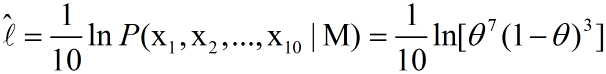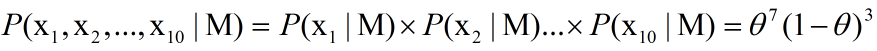 我们定义M为模型(也就是之前公式中的f),表示抽到白球的概率为theta,而抽到红球的概率为(1-theta),因此10次抽取抽到白球7次的概率可以表示为: