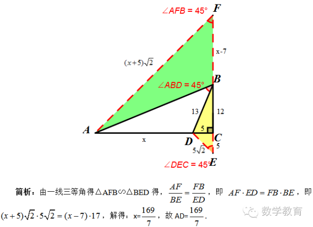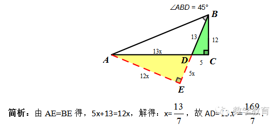 (第二十五届“五羊杯”卷第19题)如图,△ABC中,∠C=90°,∠ABD=45°,BD=13,CD=5,则AD的长度为_____________.(注:已知数据已同比例放缩至最简整数比)