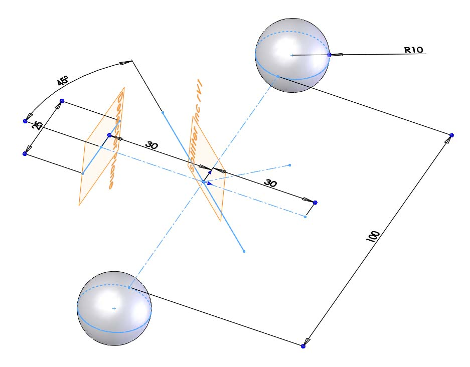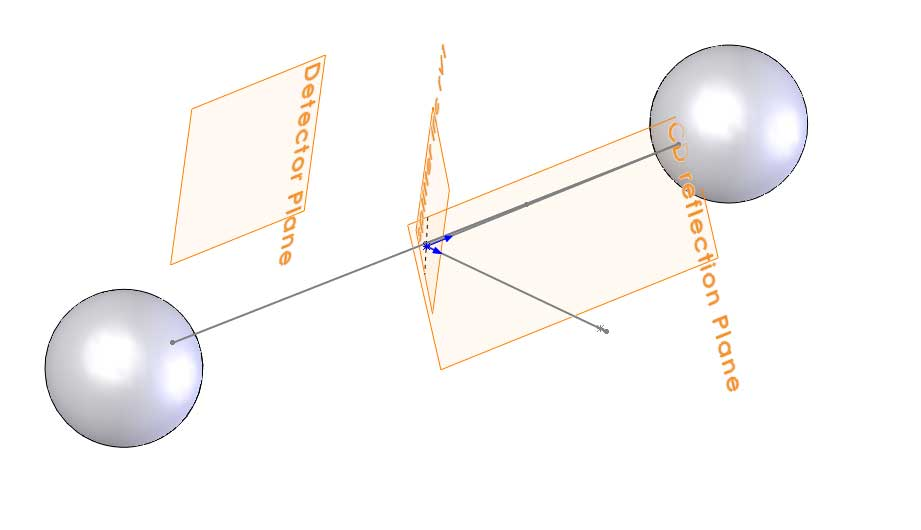 然后,可以通过使平面与表面法线向量和入射光线另一端的点重合,来创建反射平面。然后,通过在反射平面上再次使用2D草图并创建一条与入射光线对称的线(绕表面法线矢量的中心线)来确定CD的方向。然后使用3D草图将该射线扩展到第二个球体的表面(请参见图10)。