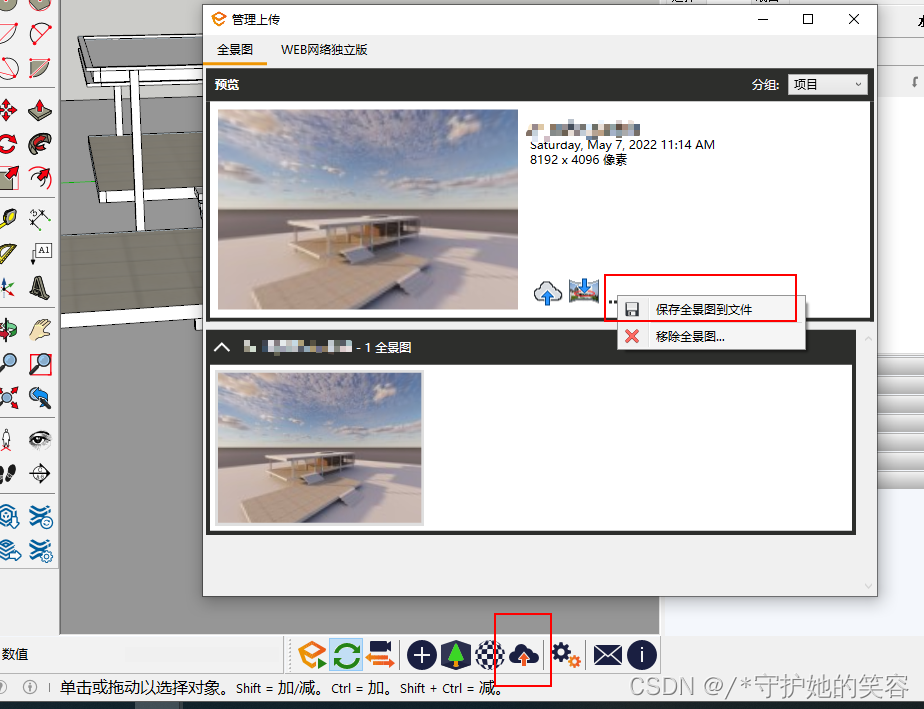 导出完以后呢,是不会自动保存的,我们需要回到sketchup种点击管理上传,这里面另存为才行【再这个地方你可以把鼠标放到全景图的两边,可以自动变向预览效果】