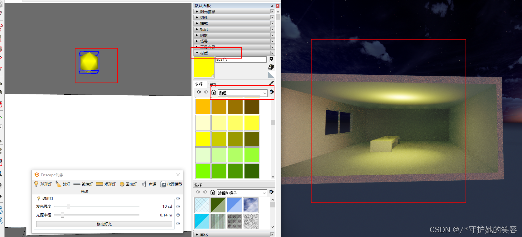 灯光的添加使用说明灯光在这里面我下面用这个模拟房间来说明单面建模和双面建模说明单面建模简单来说就是一个面,这样渲染出来的可能会出现漏光【所以我们室内建模一定要双面建模,避免出现漏光】,如下:双面建模呢,就是把面拉了一定高度出来,也就是有厚度【如墙壁】这样呢就不会有漏光的现象发生因为这是说灯光嘛,所以我先把enscape的时间调整为夜晚【按住shift+鼠标右键调整时间】球型灯光源添加添加球形灯需要