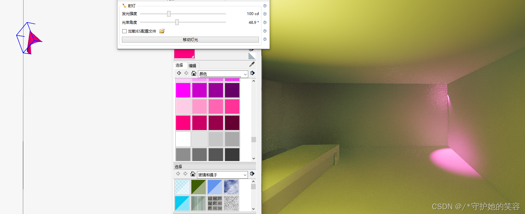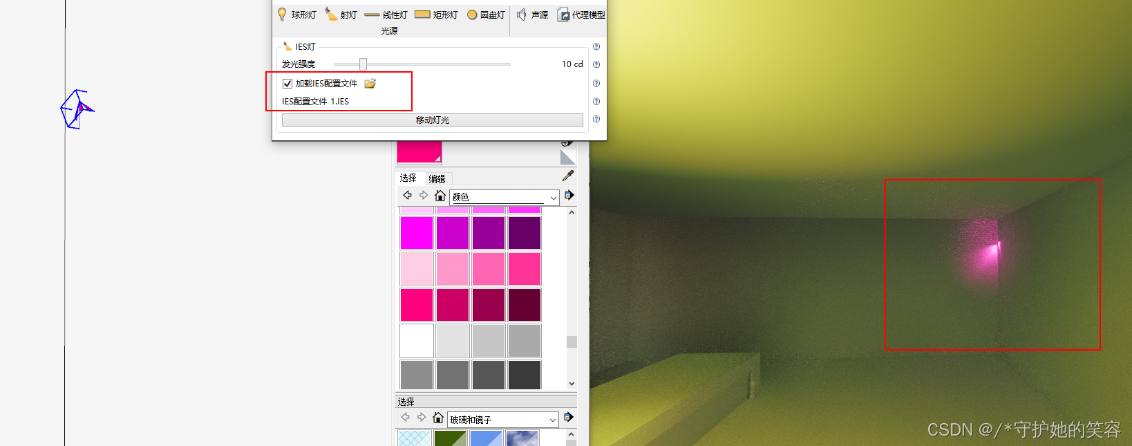 - 如果你没有创建一个射灯,是看不到这个图标的哈,所以加载IES配置文件之前你得通过上面方法创建好一个射灯并调整好颜色啦,方向啦这些。