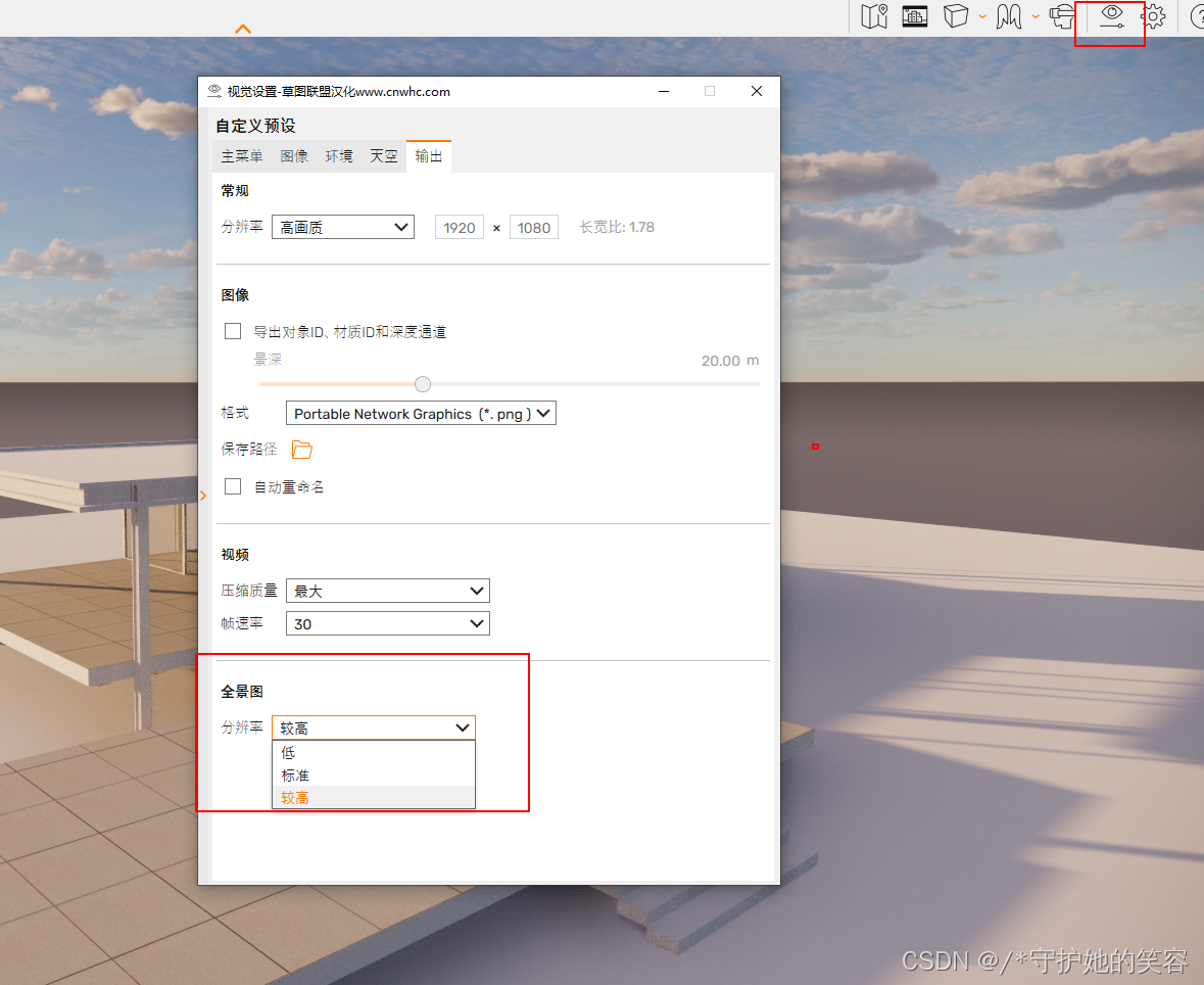 导出前需要在视角设置中修改导出分辨率【越高导出分辨率越高,消耗性能也越高】