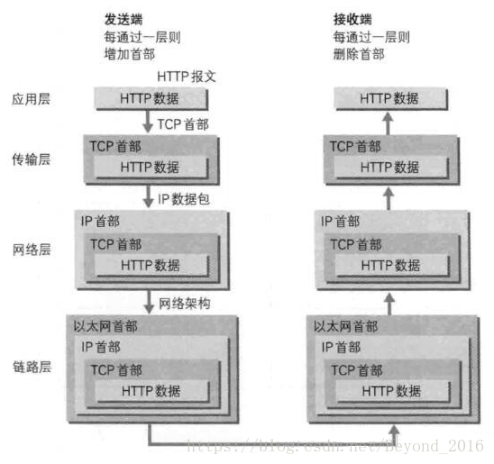 从上往下,每经过一层,协议就会在包头上面做点手脚,加点东西,传送到接收端,再层层解套出来,如下示意图: