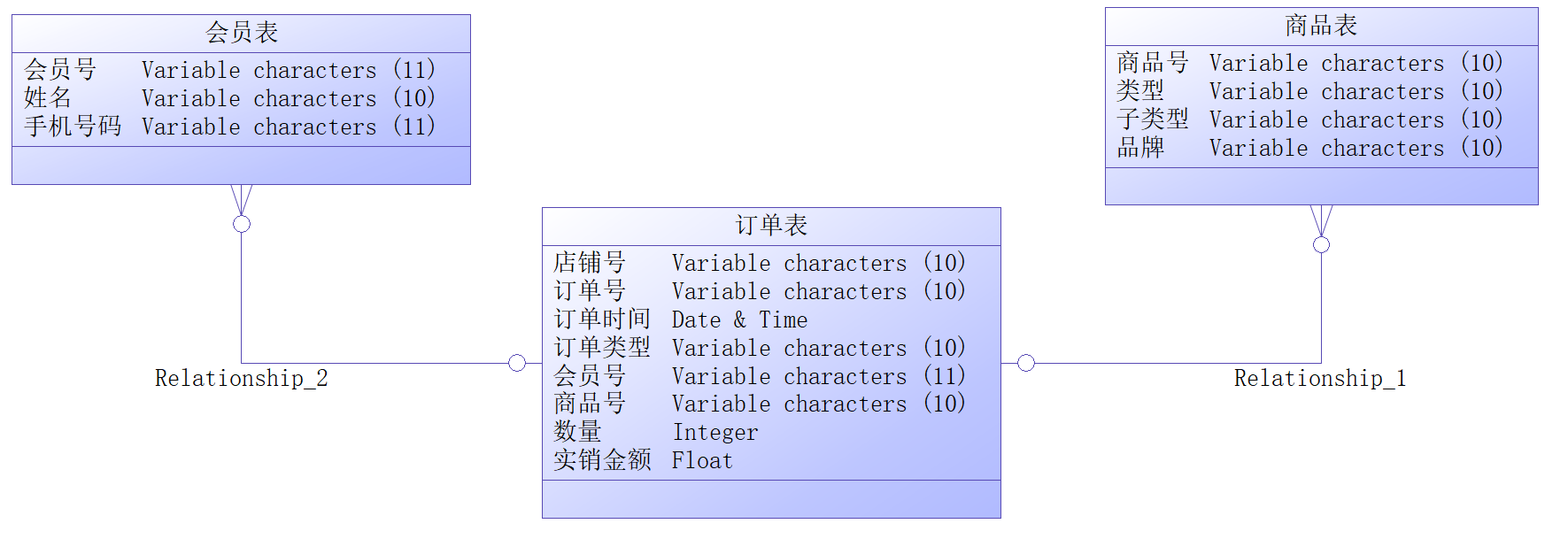 - 关系:实体与实体之间的联系,比如会员购买商品
