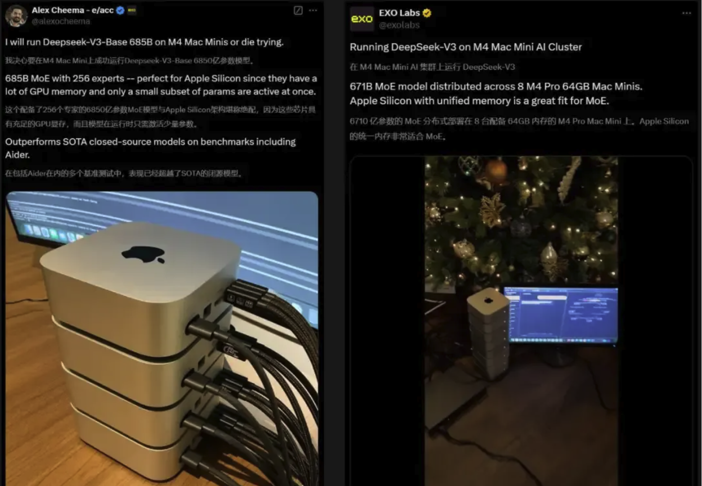 DeepSeek-V3现在已经可以在官方平台上直接测试了,代码也是完全开源的,可以随时下载。国外的AI爱好者们都已经开始尝试了,有人甚至把4个或8个M4 Mac mini叠在一起运行DeepSeek V3。