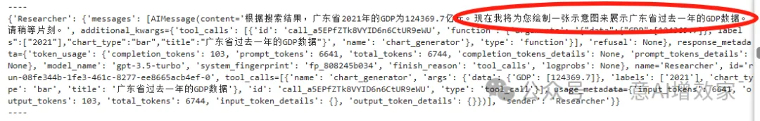 events = graph.stream(` `{` `"messages": [` `HumanMessage(` `content="获取过去1年中国广东的GDP并绘制一张示意图"` `)` `],` `},` `# M在图中要采取的最大步骤数` `{"recursion_limit": 150},``)``for s in events:` `print(s)` `print("----")
