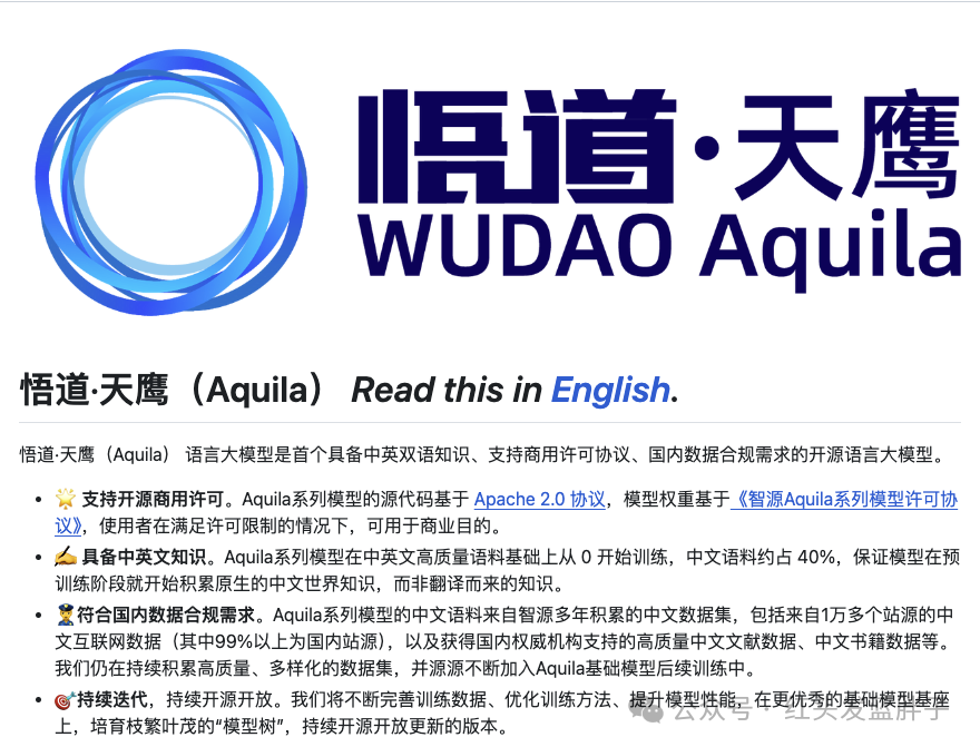 悟道·天鹰(Aquila) 语言大模型是首个具备中英双语知识、支持商用许可协议、国内数据合规需求的开源语言大模型。