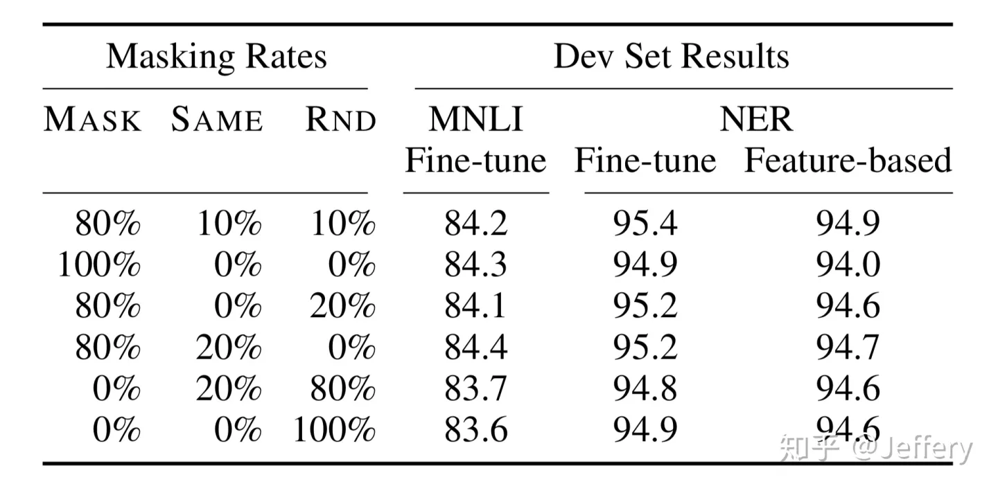 该策略令到BERT不再只对[MASK]敏感,而是对所有的token都敏感,以致能抽取出任何token的表征信息。这里给出论文中关于该策略的实验数据: