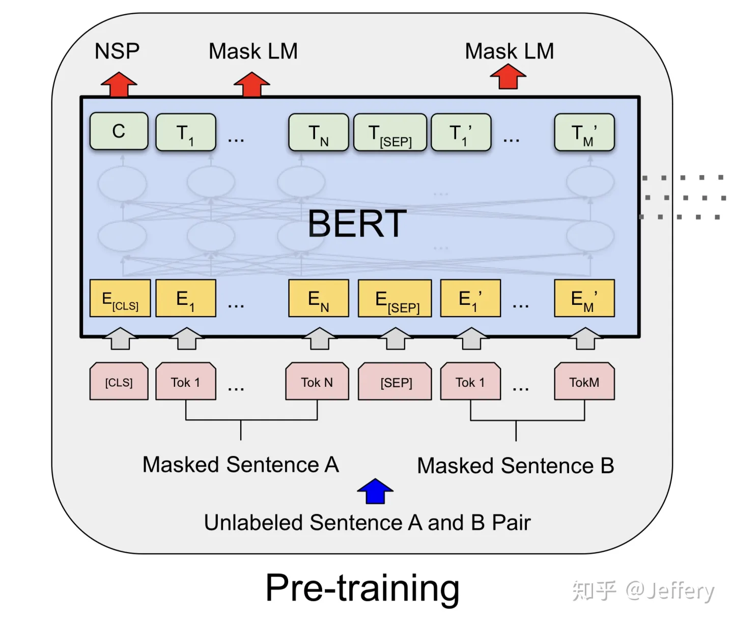 把每一个训练样例输入到BERT中可以相应获得两个任务对应的loss,再把这两个loss加在一起就是整体的预训练loss。(也就是两个任务同时进行训练)