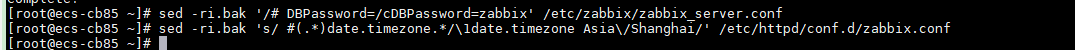 [root@ecs-cb85 ~]# sed -ri.bak '/# DBPassword=/cDBPassword=zabbix' /etc/zabbix/zabbix_server.conf