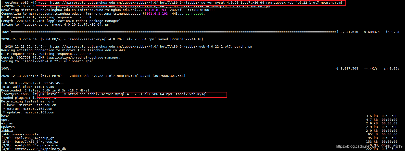 [root@ecs-cb85 ~]# wget https://mirrors.tuna.tsinghua.edu.cn/zabbix/zabbix/4.0/rhel/7/x86_64/{zabbix-server-mysql-4.0.20-1.el7.x86_64.rpm,zabbix-web-4.0.22-1.el7.noarch.rpm}