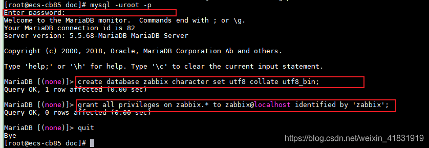 [root@ecs-cb85 doc]# zcat /usr/share/doc/zabbix-server-mysql-4.0.20/create.sql.gz | mysql -uzabbix -pzabbix zabbix