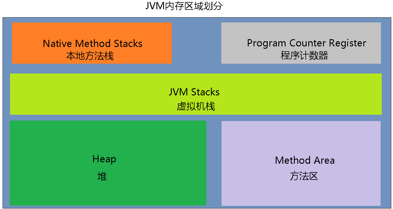 JVM中的内存区域共划分为五大部分,分别为虚拟机栈、堆、程序计数器、本地方法栈和方法区,如下边这张图所示: