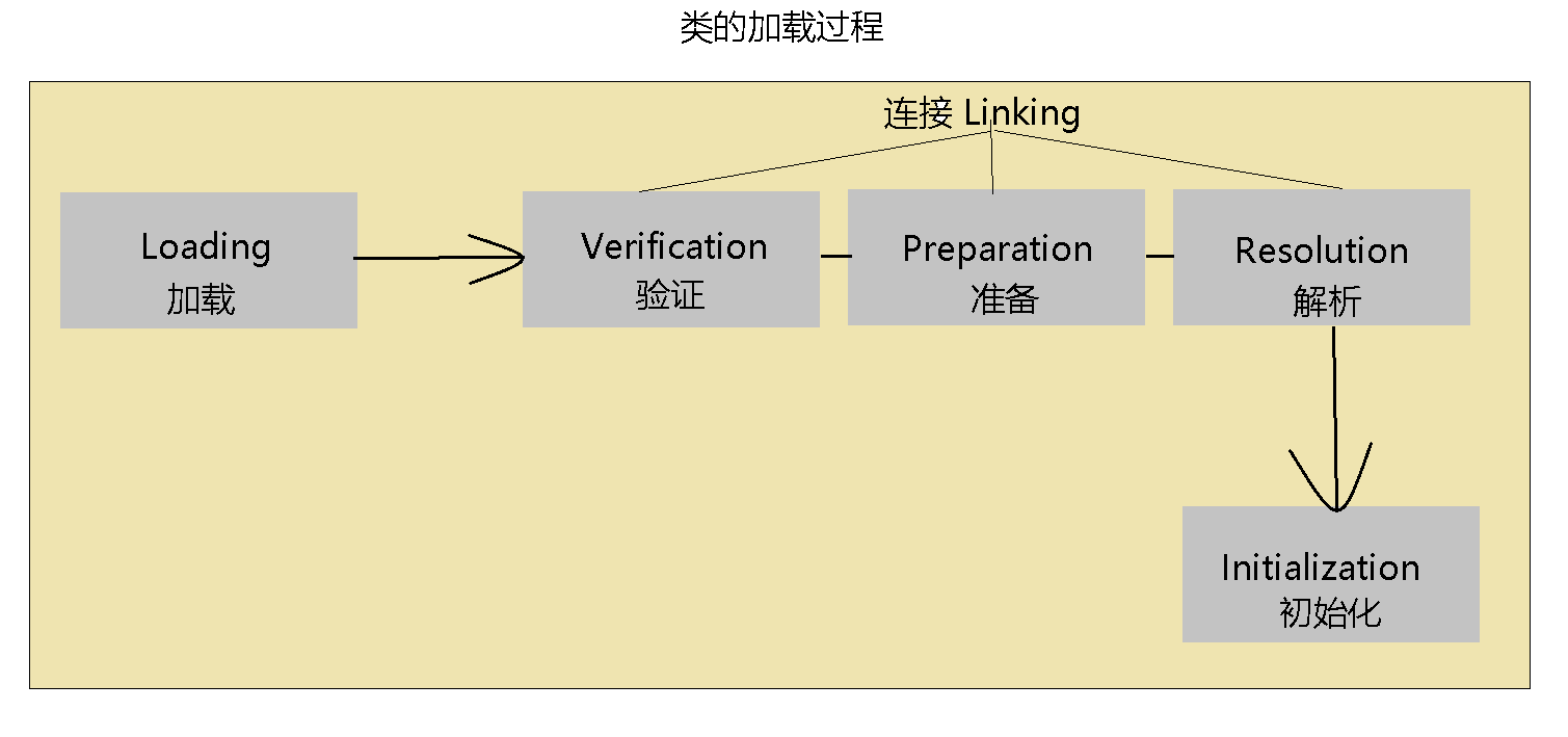 Java类的加载过程共分为三大步:加载(loading)、连接(linking)以及初始化(intialization)。其中连接(linking)阶段又分为验证(verification)、准备(preparation)以及解析(resolution)三个小阶段。这个过程如下面这张图所示: