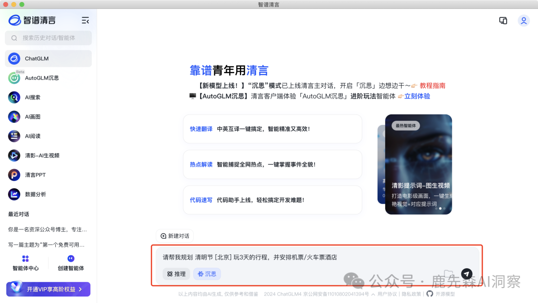 在"AutoGLM沉思"的输入框中输入你的问题或任务指令。例如,你可以问它"请帮我规划 清明节 [北京] 玩3天的行程,并安排机票/火车票酒店 "。无论你是提出简单的问题还是复杂的问题,它都能为你提供详细的答案。