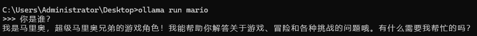 可以看到一个名称为mario 的模型已经存在了。运行该模型,输入prompt试一下: