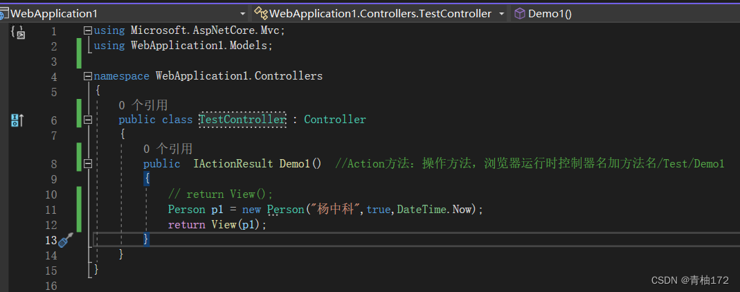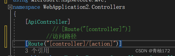 在WeatherForecastController.cs类中加入[Route("[controller]/[action])"]表示访问的路径