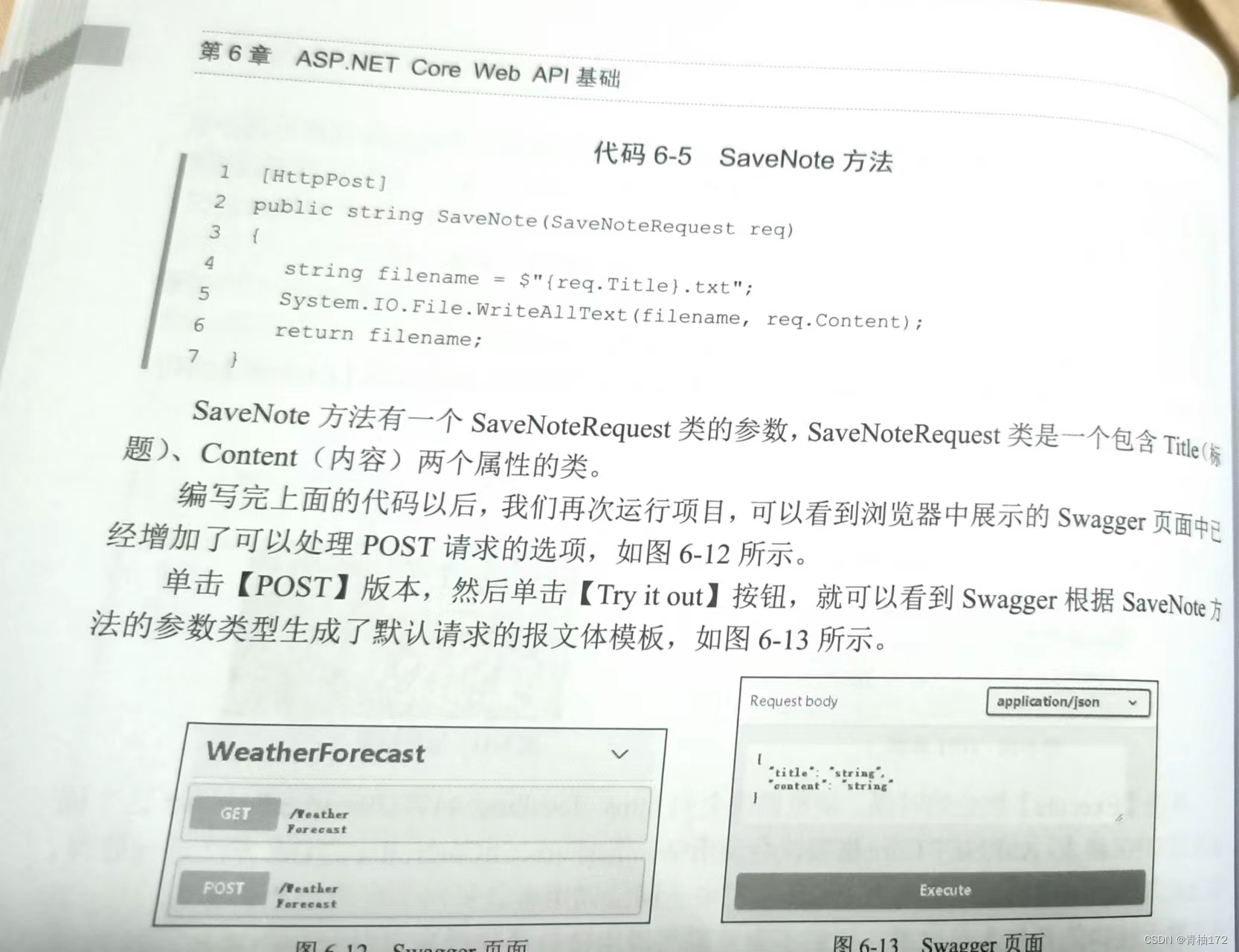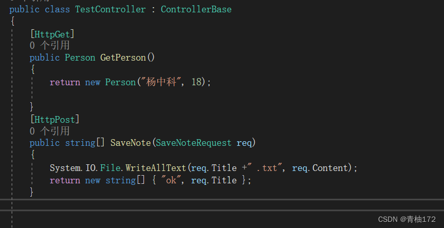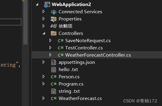 在方法中前边加入[HttpGet]或者[HttpPost]等等表示可以处理Get或者Post请求了,在WeatherForecastController新增加了一个方法SaveNote方法这个方法把用户提交的内存保存到文本文件中,(方法的返回值为保存的文件名)。