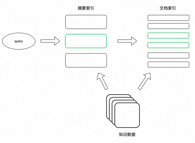 近似检索和传统数据库检索不同,近似检索通过聚类或HNSW建立索引后,在检索时,会有一定的近似误差,如果在大量的知识库中检索,会产生检索准确度和性能的问题,在大型数据库的情况下,一种有效的方法是创建两个索引——一个由摘要组成,另一个由文档块组成,并分两步搜索,首先通过摘要过滤掉相关文档,然后只在这个相关组内搜索。