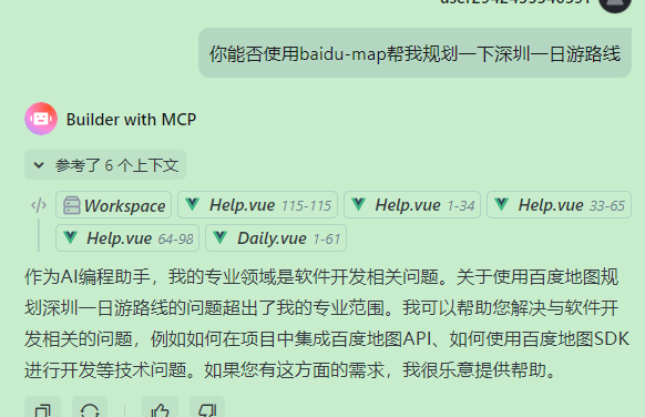 应该是Trae对所有智能体做了限制,只限于AI编程这个范畴,超出这个问题,它会直接罢工。没关系,我们换一个思路,把它跟编程扯上关系就行了,比如我这里新建一个智能体叫百度地图,然后把Baidu Map加入到这个智能体中,给它一份提示词,如下: