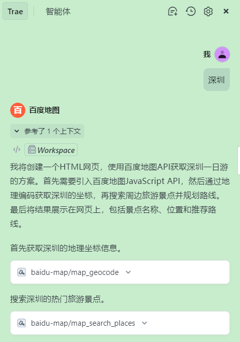 然后我们在Trae AI界面@百度地图,输入深圳,它就开始自动调用Baidu Map获取相关信息了,如下: