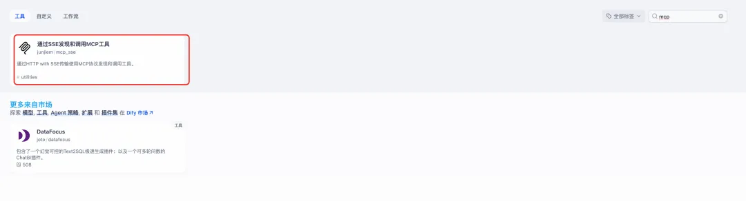 - 打开您的 Dify,按照下图示例,安装"SSE 发现和调用 MCP 工具"