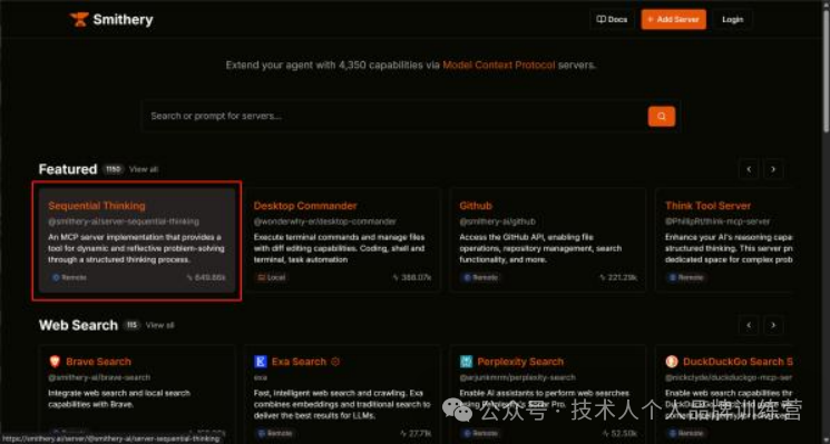 - Smithery 平台:作为MCP 服务器的集中管理平台,Smithery 聚集了大量的MCP服务器,方便开发者查找和使用。