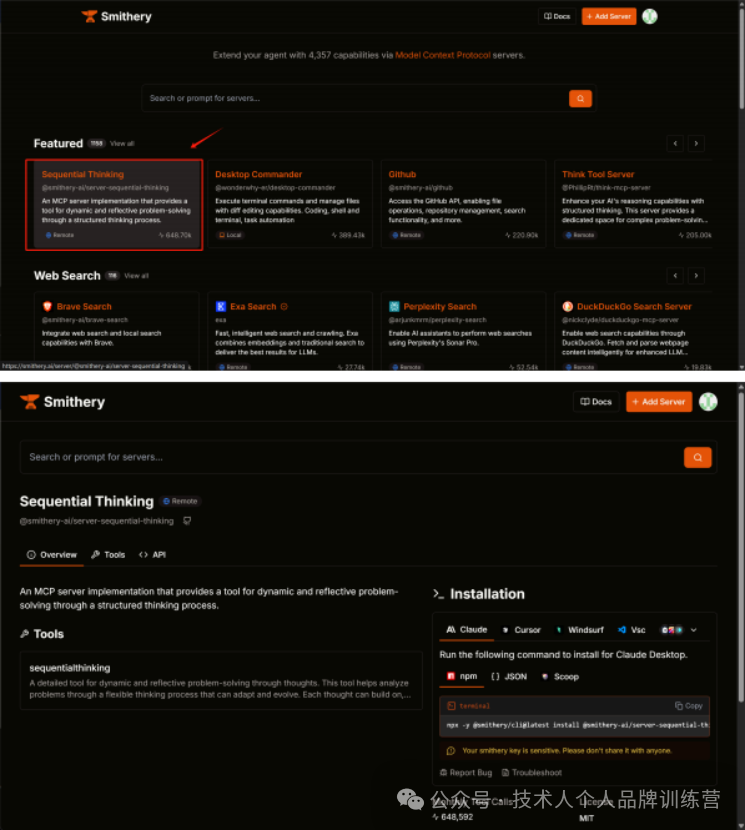 - Smithery 平台:提供统一的界面和CLI 工具,简化了MCP服务器的发现、安装和管理过程。用户可以通过简单的命令或界面操作完成服务器的部署和配置。