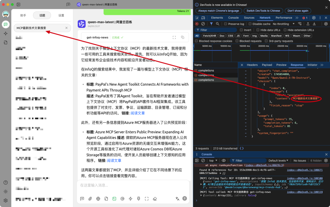 可以看到第二次调用,模型选择使用 infoq 工具获得资讯后组织语言展示给用户。
