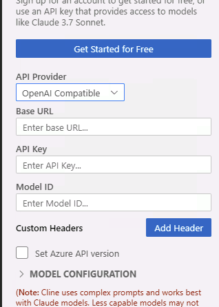 - 打开 Cline 或 RooCode 的设置界面(通常可以通过点击插件图标或使用命令面板