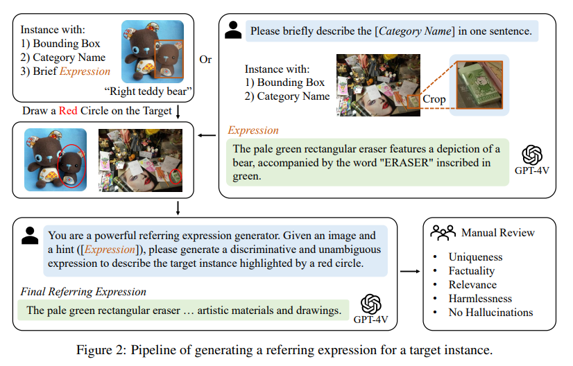 给定目标实例及其对应的图像,利用GPT-4V和人类的循环,生成精确和详细的指称表达,分成三个步骤,如下图所示: