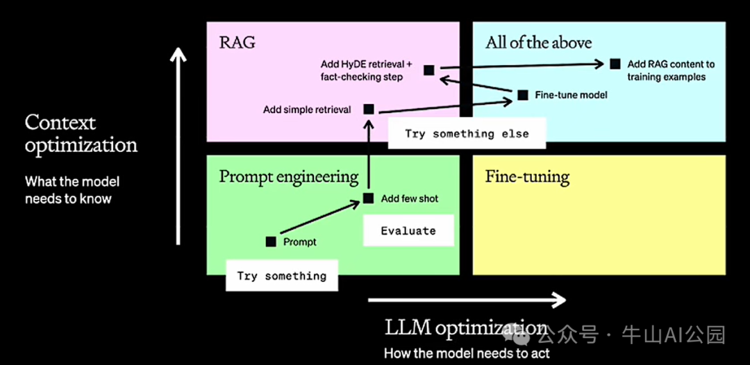上下文优化: 对应上图竖轴,竖轴表示大模型的知识能力,这个纬度主要关注私域数据,是让模型知道它所不知道的事情,包括:模型训练中从未见过的数据,比如内部代码、文档、规范、策略等。这个维度主要解决模型输出内容上的相关性。