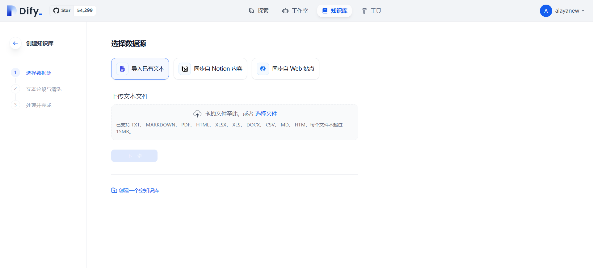 1.首先选择数据源,可以从现有的文件、Notion以及Web站点导入,也可以直接创建一个空的知识库。