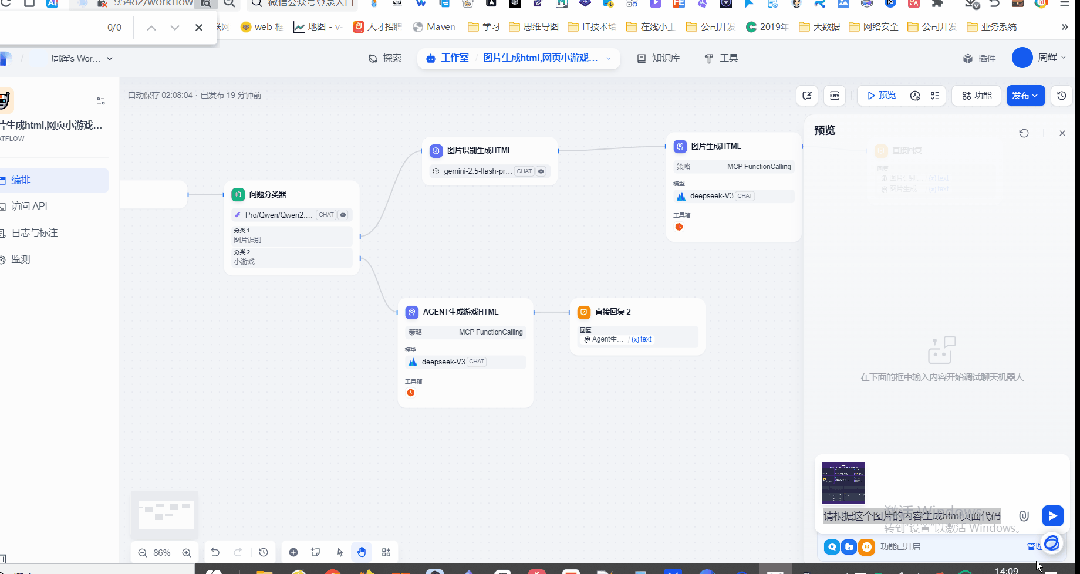 以上工作流主要有2块功能,功能1 主要实现图片识别并生成HTML 页面。(有之前网友给我留言说这块如何制作,这块给大家解答一下)。另外一个功能就是下面的直接调用AI agent智能体生成HTML 页面。