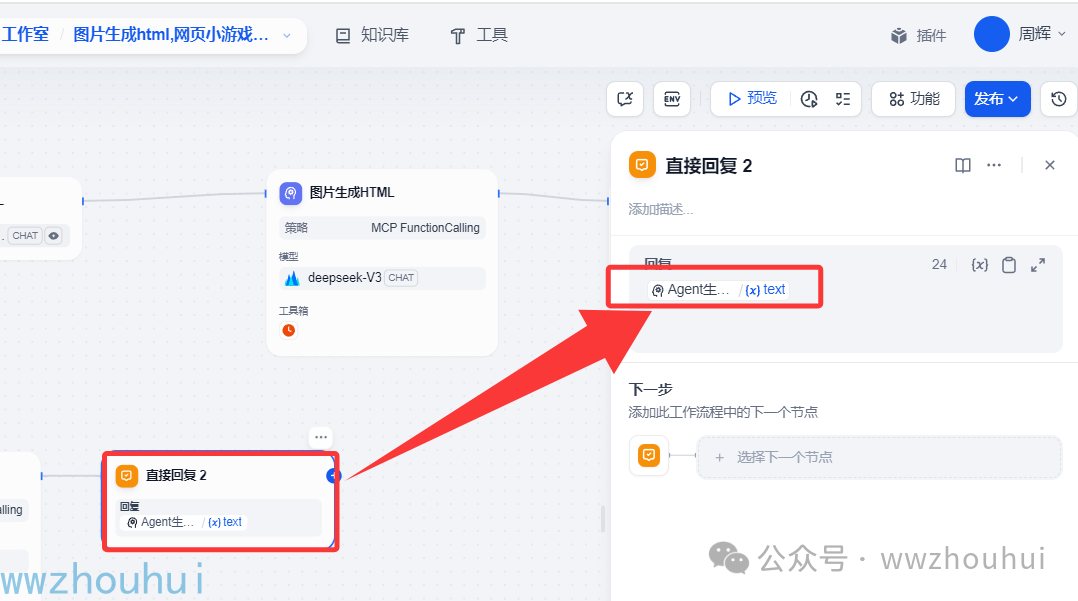 这个是问题分类器第二个问题分类接入,主要的功能是用户输入的提示词通过调用AI Agent来生成网页版本HTML页面小游戏。这里的配置和上面的Agent非常类似,这里就不做详细介绍了。