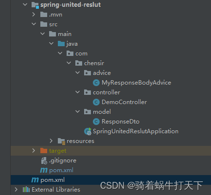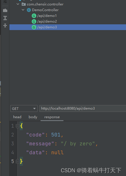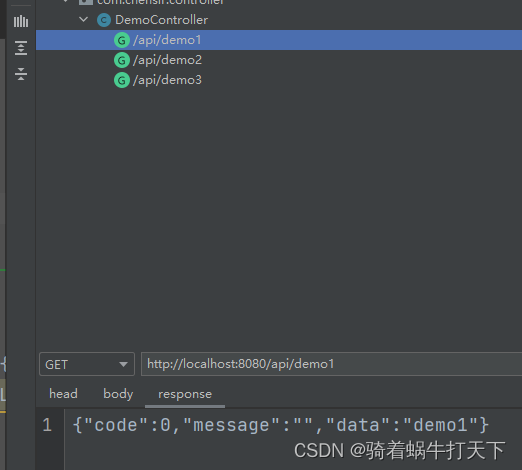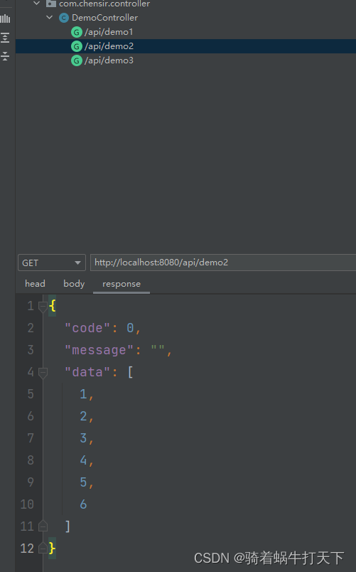 2、下面以对返回数据封装统一格式为例进行演示(注意仅对返回值为 ResponseEntity 或者是有@ResponseBody 注解的控制器方法进行拦截,@RestController 相当于是类中的所有方法上都加了 @ResponseBody)。
