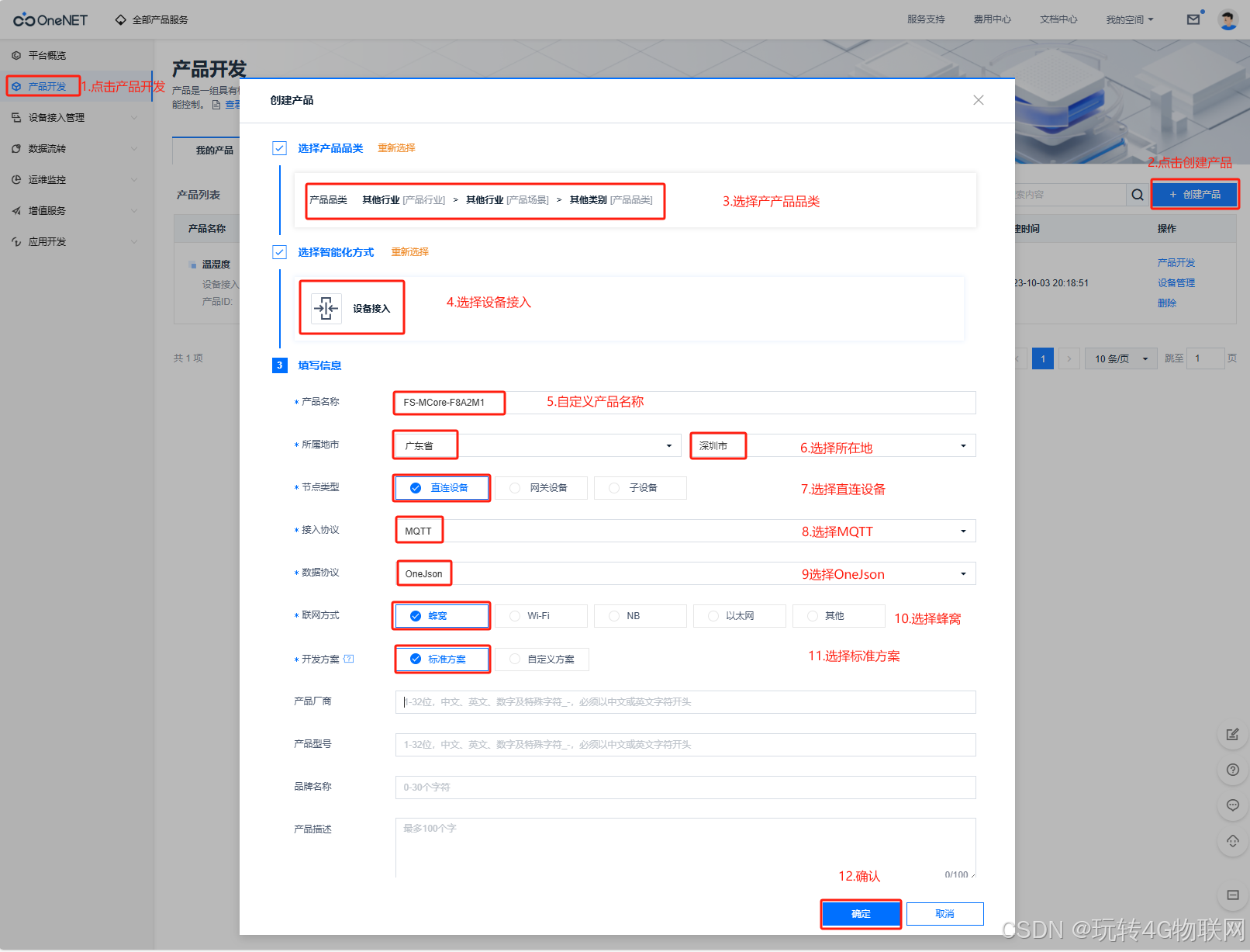 (1)点击产品开发->点击创建产品->选择产品品类->选择设备接入->自定义产品名称->选择所属城市->选择直连设备->选择MQTT协议->选择OneJson->选择蜂窝->选择标准方案->点击确定: