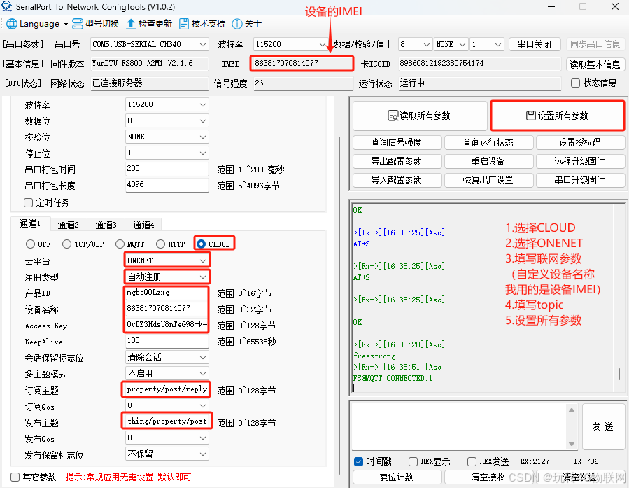 (1)选择CLOUD->选择ONENET->填写第三章记录的连接参数->点击设置所有参数,下面等待连接就行了: