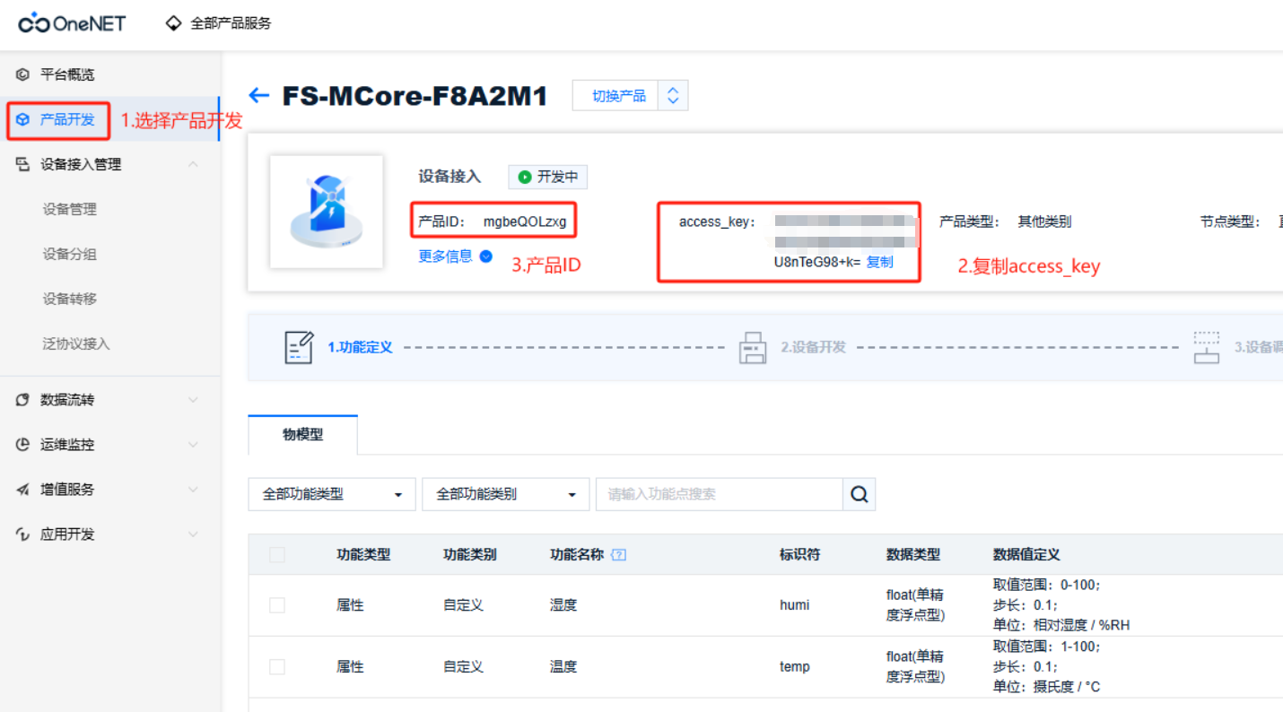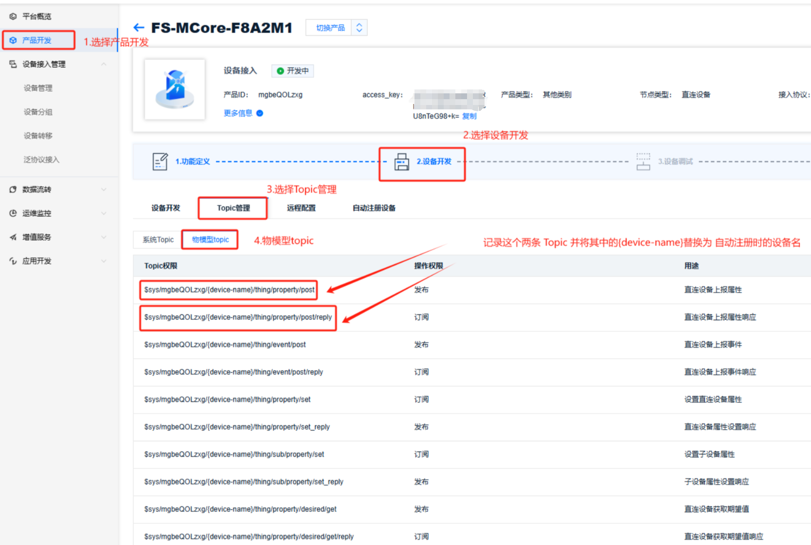 (1)选择设备管理->记录access_key,产品ID: