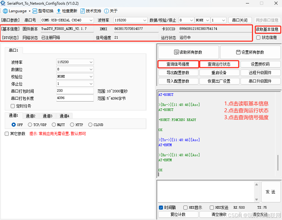 (2)点击读取基本信息,查看基本信息是否如图完整->点击查询运行状态,查看是否注册上网络以及设备运行状态->点击查询信号强度,查看设备信号强度是否正常。(0-7很差,8-13能注上网,14-18较差,19-25正常,26-31优秀,99异常):