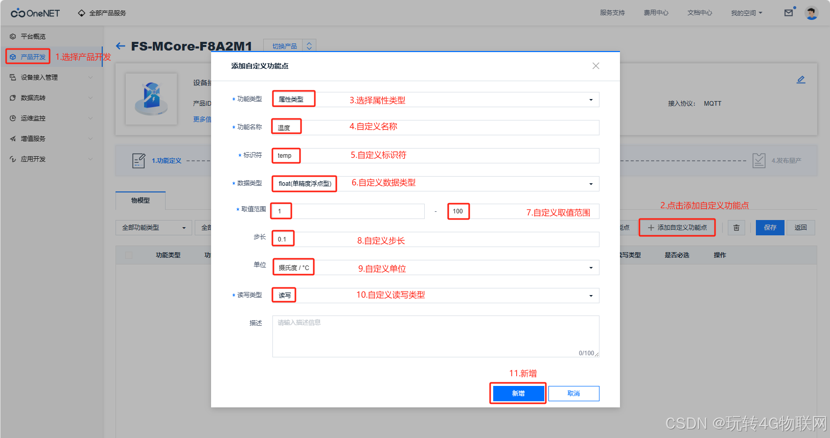 (1)产品开发->添加自定义功能点->选择属性类型->自定义产品名称->自定义标识符->自定义数据类型->自定义取值范围->自定义步长->自定义单位->读写类型->点击新增(添加湿度按照该流程即可):