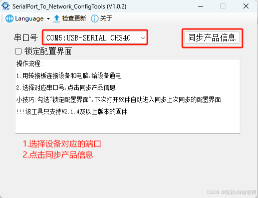 (1)在资料包里双击打开SerialPort_To_Network_ConfigTools参数配置软件->选择设备对应的端口->点击同步产品信息:
