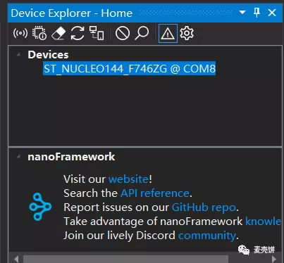 由于ST NUCLEO-F746ZG 跟之前文章不同 , 一个Micro USB线 即能跟ST-LINK连接, 又支持串口, 还能识别出来存储, 因此一根线搞定一切, 也不需要弄乌七八糟的杜邦线之类的, 因此简单很多。 按照用C#在STM32上写第一个Hello world 的方法, 我们依然需要下载他的 https://bintray.com/nfbot/nanoframework-images-community-targets/ST_NUCLEO144_F746ZG/_latestVersion 解压后, 烧写, 然后VS中Device Explorer 中就可以看到设备, 如下图: