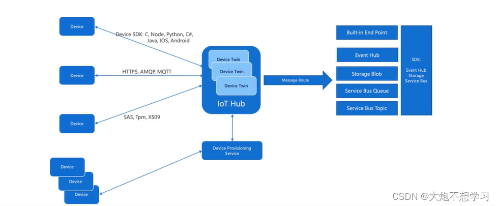 IoT Hub(IoT中心)是一个PaaS的服务。我们不需要对这个PaaS服务后端的服务器、网络、存储等等这些内容做过多的部署。我们只需要在云端点击生成PaaS服务,然后配置一下基本的参数,就可以使用了。它的使用非常简单,单个IoT Hub支持100万台设备的接入,同时我们也提供了多种语言的sdk,如果我们基于Azure IoT Hub去做一个物联网的方案,那我们的设备接入也会非常简单。首先挑选一门你会的语言,然后挑选一个sdk,然后在这个sdk当中做一些简单的修改,通过几种设备身份验证的方式,通过常见的物联网协议,就能够让设备连接到云端。通常情况下只要二三十分钟就能够构建一个简单的设备连接到云端的小型的物联网系统。同时构建的这个系统是一个能够承载100万台设备接入的这样的一个大型的物联网能力的系统。有中间这个大型的网关服务,那设备能够通过这些sdk、协议、身份验证的方式将数据发送到云端。