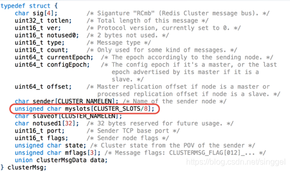 (1)节点自身信息,主要是自己负责的slots信息:slots[CLUSTER_SLOTS/8],占用2KB;