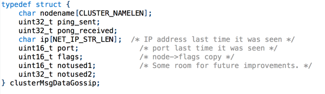 节点状态信息:clusterMsgDataGossip,ping、meet、pong采用clusterMsgDataGossip数组作为消息体。