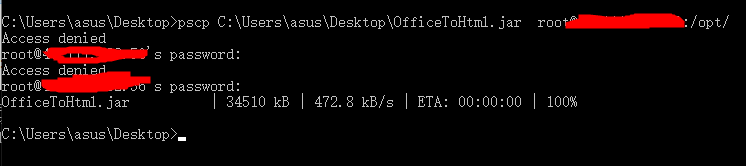 pscp root@4xxxxxxxx:/opt/OfficeToHtml.jar D:/ root@4xxxxxxx's password: OfficeToHtml.jar | 15072 kB | 376.8 kB/s | ETA: 00:00:51 | 43%