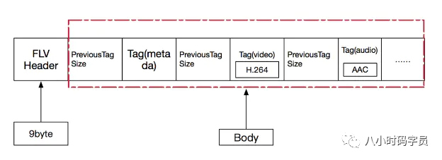 Body部分是一个个的 PreviousTag+Tag 单元组成,每个单元表示的可能是视频流的一个NALU、也可能是音频的bit流。