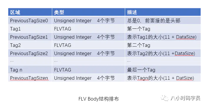 Body 是由一个个 PreviousTag+Tag 单元组成的。每个Tag下面有一块4个字节的空间,用来记录这个Tag 的长度。PreviousTagSize用于逆向读取处理,表示的是前面的Tag的大小,第一个PreviousTagSize为0,因为他前面没有tag。FLV Body 的信息排布如下:
